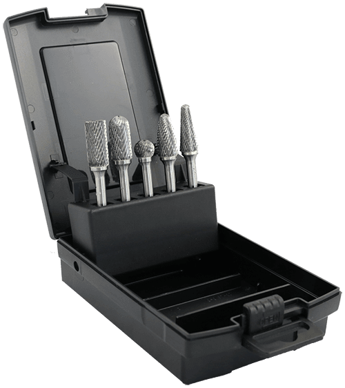 The kit comes with a range of head shapes, all with 6mm spindle. Suitable for use on a variety of hard materials such as steels, alloys and cast iron.