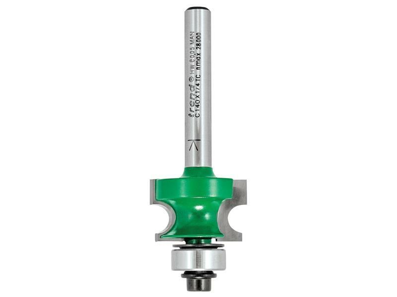 Trend Craft Pro Bearing Guided Corner Bead for attractive edge moulds. A full corner bead can be produced by making a second pass at 90°. With two carbide TCT cutting tips for cleaner cutting edges and fast clearance of waste in all timber and timber based materials. 1/4in shank for easy control in smaller routers with 'K'mark to ensure safe working practices. A PTFE coating minimises heat and resin build up for increased cutter performance and longevity.