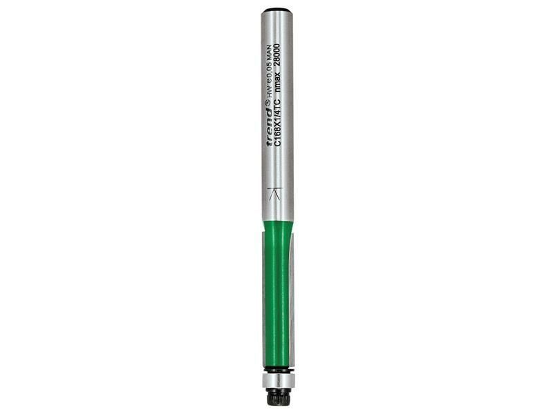 The Trend C168 x 1/4TC Guided Trimmer has two flute carbide TCT tips. Used for trimming plastic or plywood overlays. Its 6.3mm diameter allows it to follow more intricate curves. 25.4mm cutting depth for replication of thin components with templates.