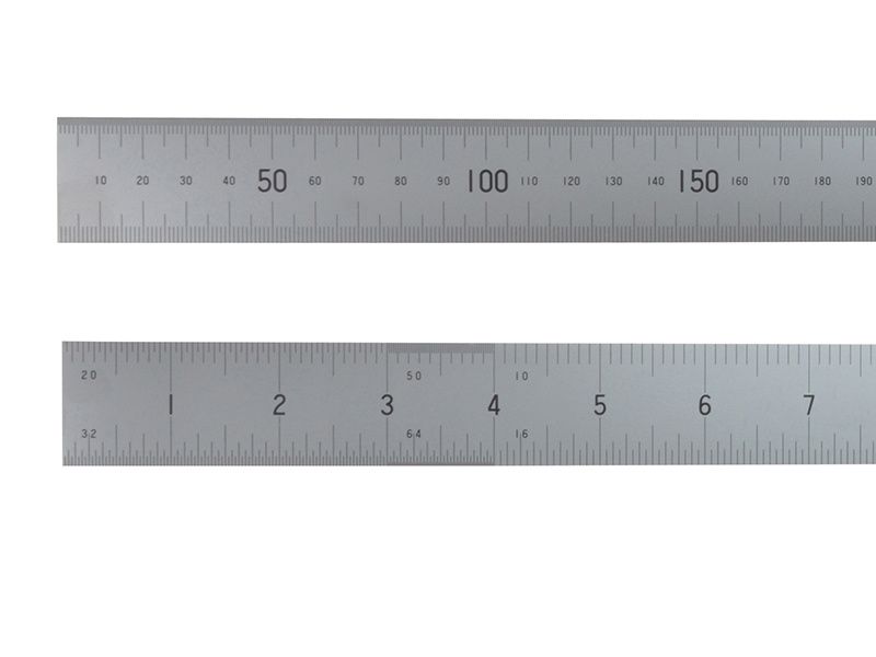 Fisher steel rule with satin chrome finish and photo etched markings, subdivided in mm, and 10th, 16th, 20th, 32nd, 64th.