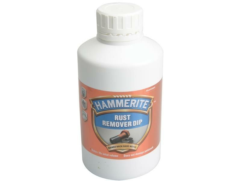 Hammerite rust remover provides effective results by simply immersing rusty items overnight in a solution of 9 parts water to 1 part Hammerite- your items will be restored to bare metal. Its safe to your skin, paintwork and the environment. Size: 500ml