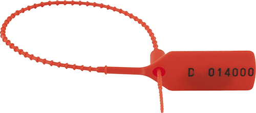 Polypropylene plastic seals uniquely numbered in sequential order (i.e. D 013001 - D 0141000). Tie locking length: 160 mm. Flag Dimensions (W x L): 19 x 36 mm.