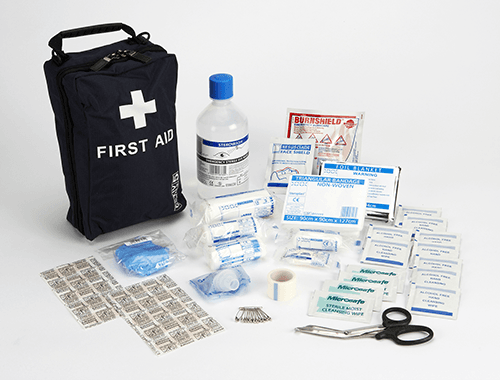 Contents: 1 x Guidance Leaflet; 1 x Contents List; 1 x Medium Sterile Dressing; 1 x Large Sterile Dressing; 1 x Triangular Bandage; 2 x Safety Pins; 1 x Sterile Eyepad; 10 x W/Proof Plasters; 4 x Sterile Saline Wipes; 1 x Microporous Tape; 1 x Nitrile Gloves (pairs); 1 x Sterile Finger Dressing; 1 x Resuscitation Face Shield; 1 x Foil Blanket; 1 x Sterile Eyewash (500ml); 1 x Hydrogel Burn Dressing; 1 x Scissors; 1 x Conforming Bandage