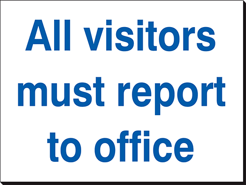 This All Visitors Must Report To Office Sign is used to inform the public that they need to report to the office before making their way around the site or building. Designed for use in a wide range of situations, including building sites, factories, estates and garages, it is fully waterproof and can be used inside or outside.