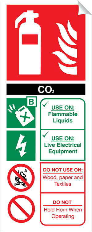 This Fire Extinguisher CO2 Sign is used to indicate the type of fire extinguisher present, and for what types of fire it can be used. A CO2 fire extinguisher contains Carbon Dioxide and can be used on fires involving flammable liquids or live electrical equipment.
