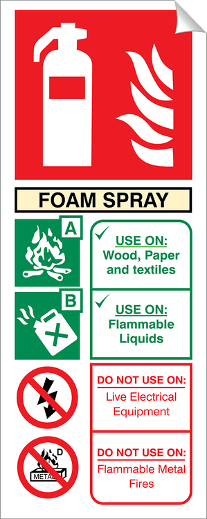 This Fire Extinguisher Foam Spray Sign is used to indicate the type of fire extinguisher present, and for what types of fire it can be used. A foam spray fire extinguisher can be used on fires involving fuel, by forming a thick frothy blanket over the fire, to extinguish it.