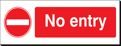 Prohibitory signs or "No” signs are generally depicted with a black safety symbol in a red circle with a diagonal cross through.