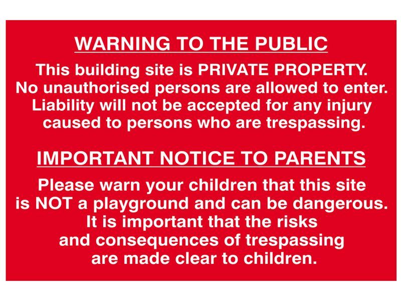 Message: This sign provides a warning to public and parents with regard to a building site. It reads: