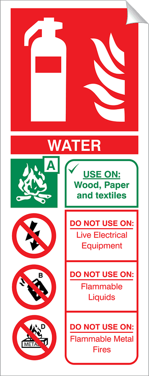 This Fire Extinguisher Water Sign is used to indicate the type of fire extinguisher present, and for what types of fire it can be used. A water fire extinguisher works by cooling burning materiak and can be used on fires involving wood, paper or textiles.
