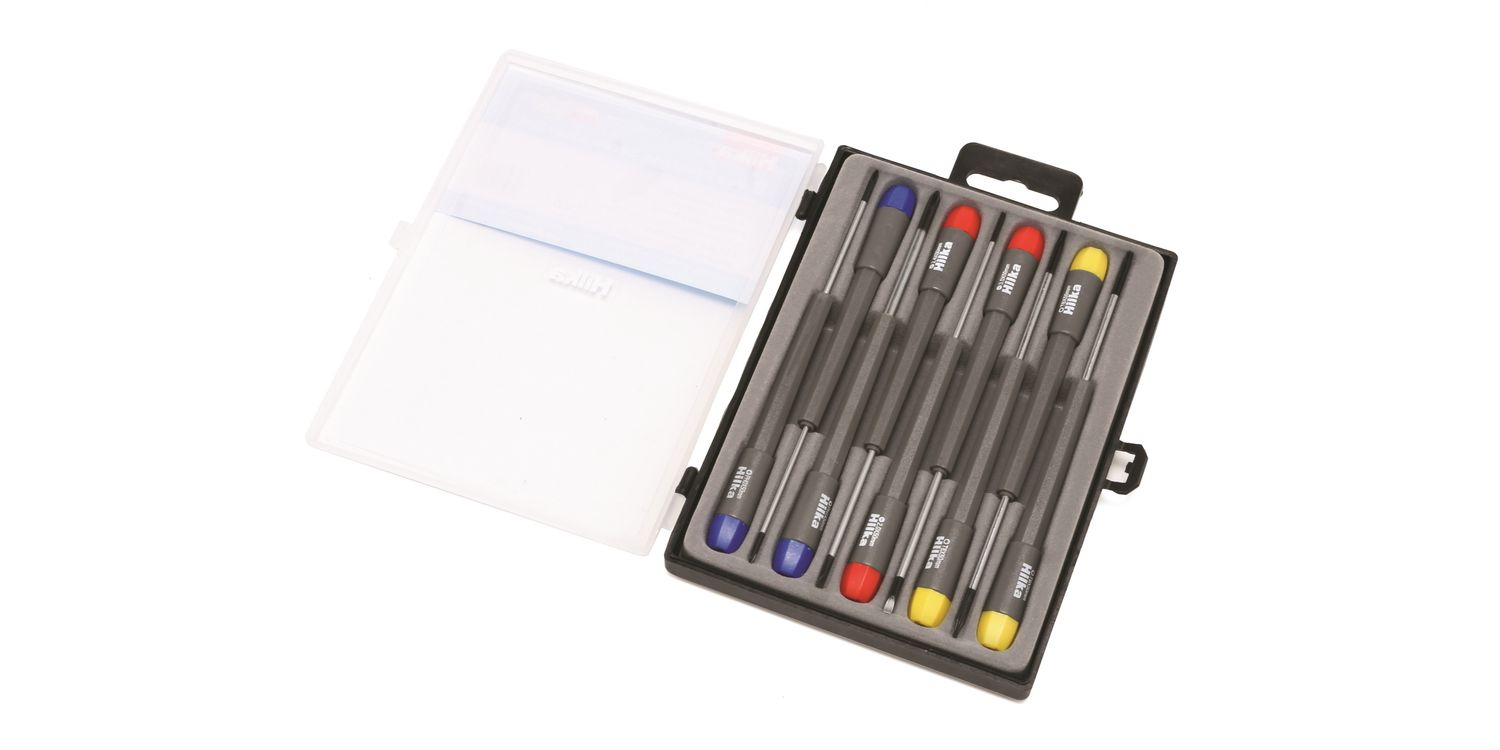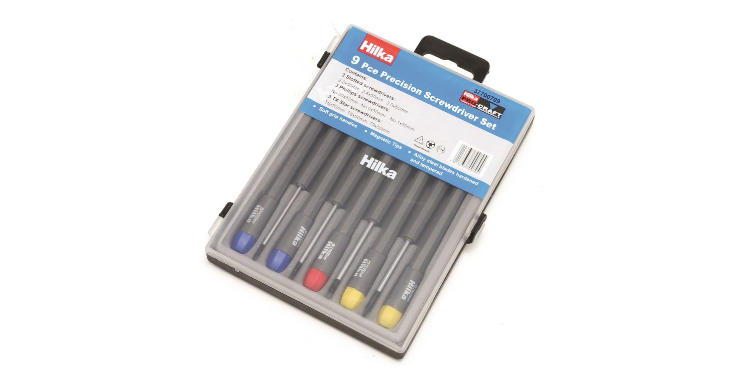 9 piece precision screwdriver set with soft grip handles and magnetic tips. Contents: Slotted 2.0, 2.4, 3.0. Phillips: PH00, 0, 1. TX Star T6, 8, 9.