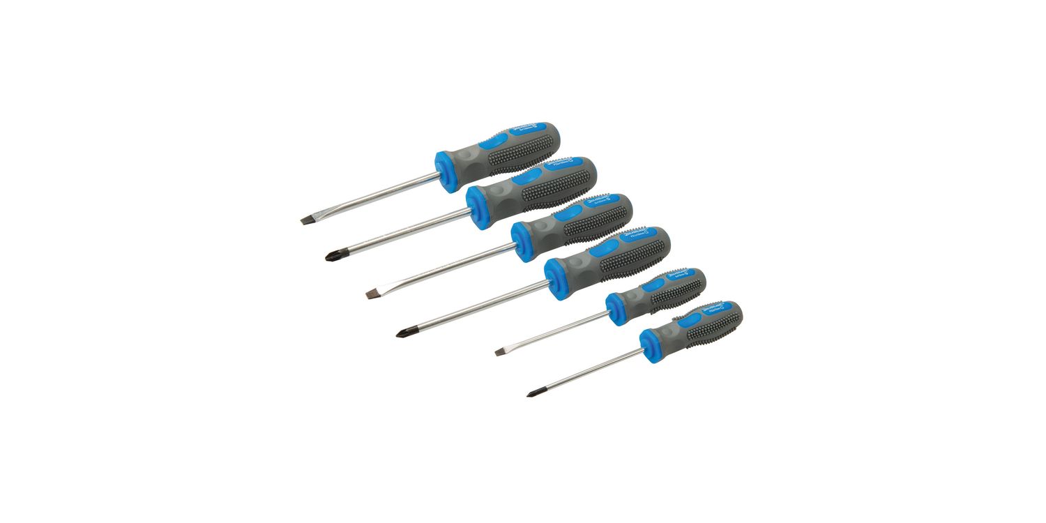 Chrome vanadium screwdriver set with hardened, blackened tips and soft-grip handles. Includes: slotted flared 3 x 75mm, 5 x 100mm, 6 x 100mm; Pozidriv PZ0 x 75mm, PZ1 x 100mm, and PZ2 x 100mm.