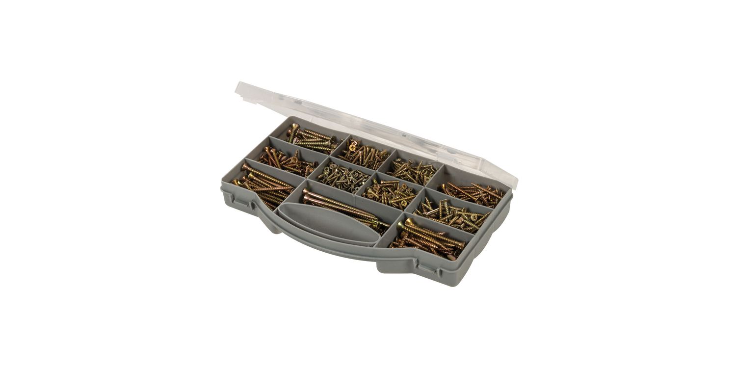 Twin-thread PZD countersunk screws. Yellow zinc passivated for corrosion resistance. Includes sizes 3 x 16, 3 x 20, 3.5 x 25, 3.5 x 30, 4 x 30, 4 x 35, 4 x 40, 5 x 40, 5 x 50, 5 x 60 and 5 x 80mm. Handy storage case with individual compartments.