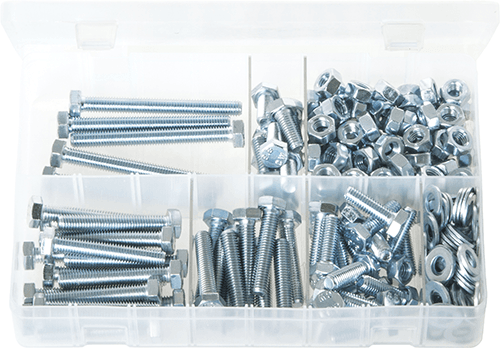 Zinc plated steel. DIN 933 Grade 8.8 (Set Screws High Tensile). DIN 934 (Steel Nuts). DIN 125 (Flat Washers).