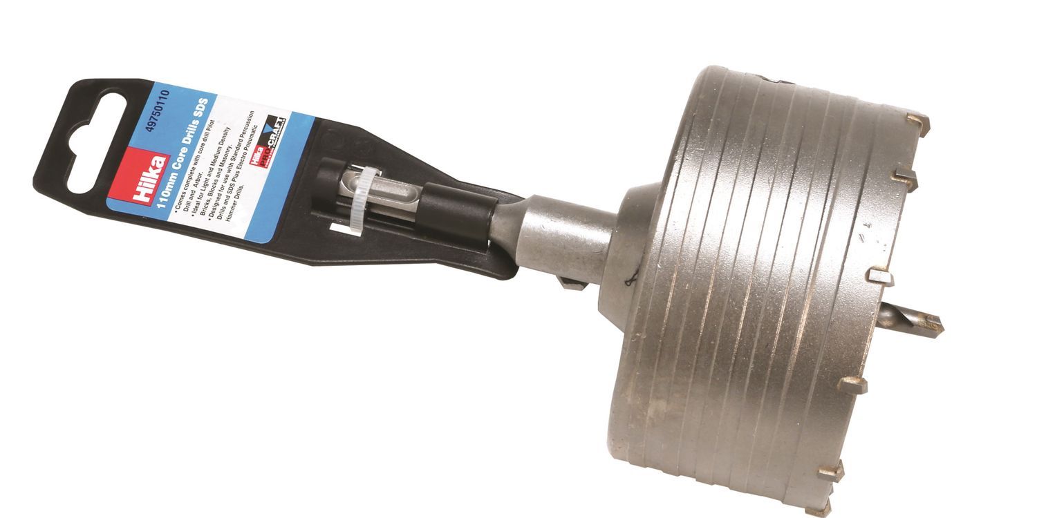 Tungsten carbide tipped core drills in a range of sizes display packed. With arbor and guide drill.