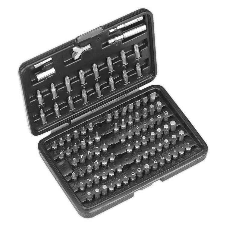 | Contents | Bits; Slotted Screwdriver (x9), Phillips Screwdriver (x8), Pozi Screwdriver (x8), TRX-Star* (x9), Security TRX-Star* (x9), Hex - Metric (x9), Hex - Imperial (x9), Security Hex - Metric (x6), Security Hex - Imperial (x6), Butterfly (x3), Spanner (x4), Spline (x3), Square (x4), Torq (x3), Tri-Wing (x4), Special Hook Bit, Magnetic Extension/Bit Holder, 1/4"Sq Drive Extension, 1/4"Sq Drive Socket Adaptor (x2) |