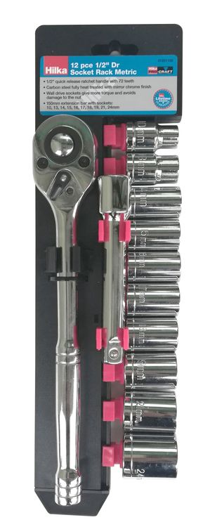 12 piece fully heat treated carbon steel socket set with mirror chrome finish. 1/2” quick release ratchet handle with 72 teeth. Wall drive sockets allow for more torque and avoid damaging the nut. Comes with 150mm extension bar and 10, 13, 14, 15, 16, 17, 18, 19, 21, 24mm sockets.