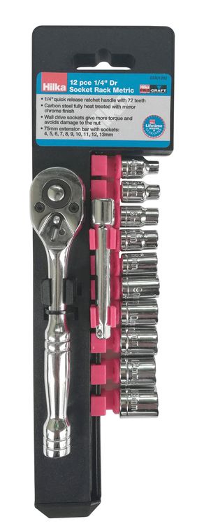 12 piece fully heat treated carbon steel socket set with mirror chrome finish. 1/4" quick release ratchet handle with 72 teeth. Wall drive sockets allow for more torque and avoid damaging the nut. Comes with 75mm extension bar and 4, 5, 6, 7, 8, 9, 10, 11, 12, 13mm sockets.