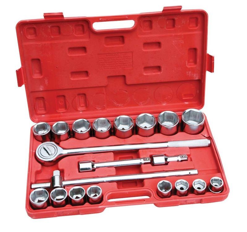 Large 3/4" drive socket set in polished finish.16 metric sockets 22, 24, 26, 27, 28, 30, 32, 36, 38, 41, 42, 45, 46, 48 and 50mm. Reversible ratchet sliding T bar 2 extensions. Comes in blow mould case with coloured sleeve.