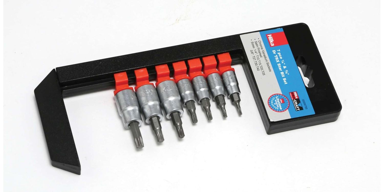Chrome vanadium satin finish 1/4" drive sizes: T10, T15, T20, T25. 3/8" drive sizes: T27, T30, T40.