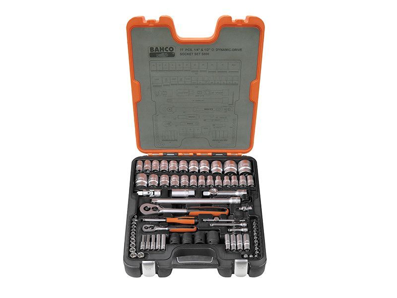 Bahco S800 chrome vanadium 1/4 and 1/2in Drive 77 piece metric and AF socket set, containing: