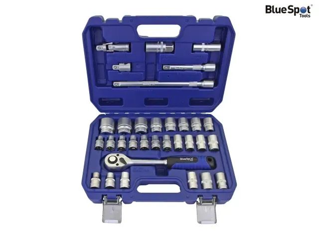 The BlueSpot Tools 1/2in Hex & 12 Point Socket Set. Manufactured from chrome vanadium for increased durability. Knurled sockets to provide a secure grip. This set includes a wide selection of hex and 12 point sockets in most popular sizes. Contains: