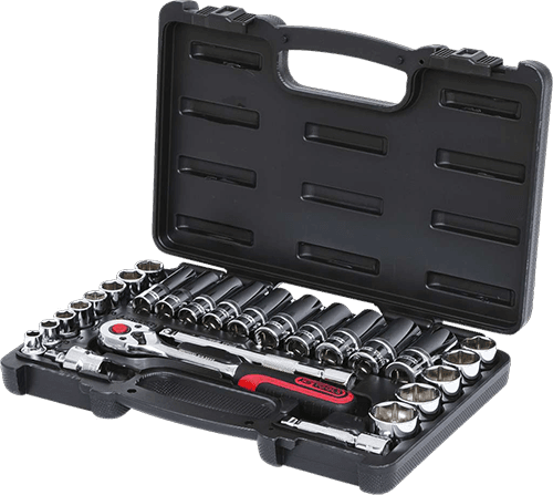 13 x Sockets 3/8": 8, 10, 11, 12, 13, 14, 15, 16, 17, 18, 19, 22, 24 mm.
