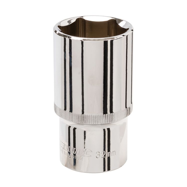 Deep 6-point hex socket for maximum torque transfer to the face of the fastener. Precision cold-forged, hardened and tempered chrome vanadium steel. Fully polished and nickel chrome-plated for durable corrosion resistance. Chamfered ends and thin walls for positive location on fastener. Knurled ring provides grip and control in the hand, and bearing hole provides solid connection to the tool.