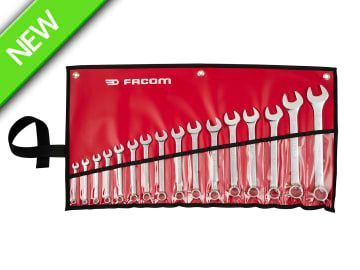 16 Piece Facom 40B.JV16PB 40B Series Slim Metric Combination Spanner Set. The 12-point OGV® profile provides more effective contact between the ring and the nut, better torque transmission, reduced risk of slipping, and longer service life. The ring end is offset by 15° for finger protection and safer, more comfortable work on flat surfaces.