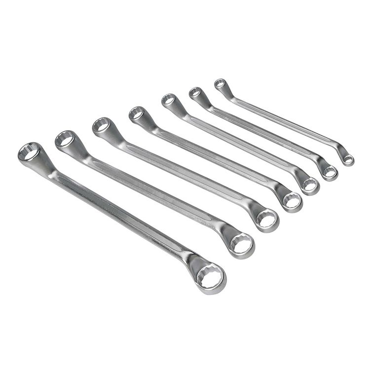 Hardened and tempered drop forged chrome vanadium steel with nickel chrome plated finish for corrosion resistance. Precisely machined and heat treated. Manufactured to DIN838. Includes 5/16" x 3/8", 7/16" x 1/2", 9/16" x 5/8", 5/8" x 11/16", 3/4" x 7/8", and 15/16" x 1".