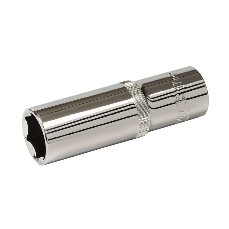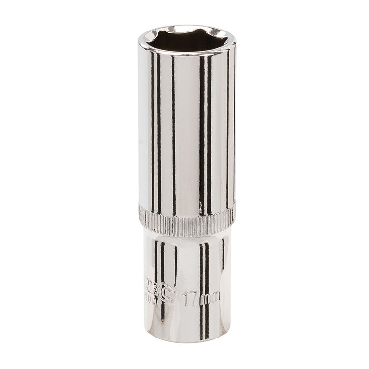 Deep 6-point hex socket for maximum torque transfer to the face of the fastener. Precision cold-forged, hardened and tempered chrome vanadium steel. Fully polished and nickel chrome-plated for durable corrosion resistance. Chamfered ends and thin walls for positive location on fastener. Knurled ring provides grip and control in the hand, and bearing hole provides solid connection to the tool.