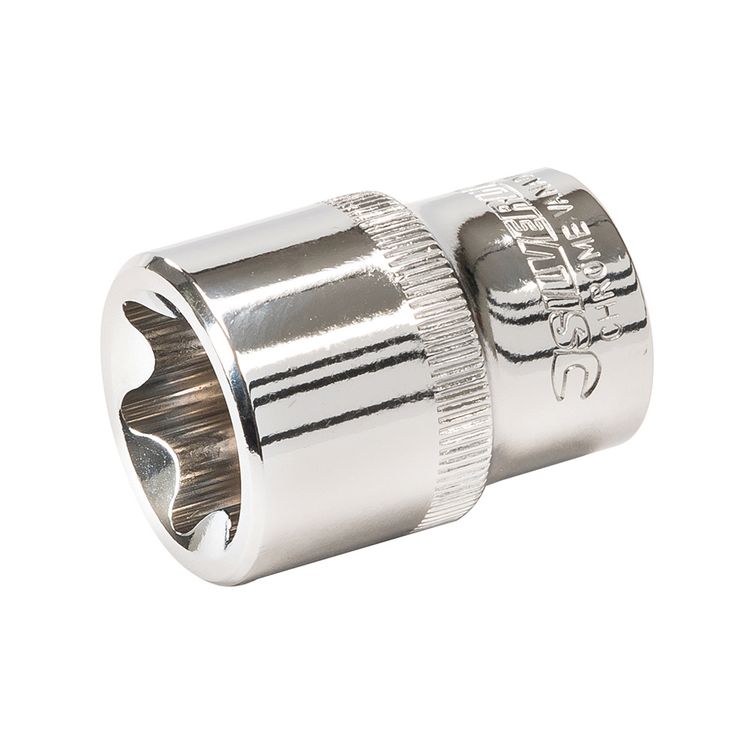 Polished chrome vanadium square drive E Trx sockets. Contents: 1/4" drive E4, E5, E6, E7, E8; 3/8" drive E10, E11, E12, E14; 1/2" drive E16, E18, E20, E22 and E24.