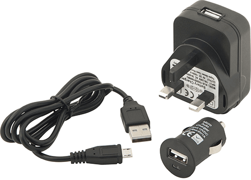 Complete with USB charging lead, mains plug and car adapter.