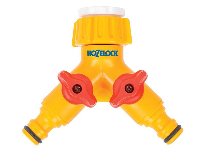 Hozelock dual tap connector. Independent water control valves for each outlet. Two Hozelock male connectors with the additional option to include a 3rd for use 'inline'. Fits most standard garden taps.