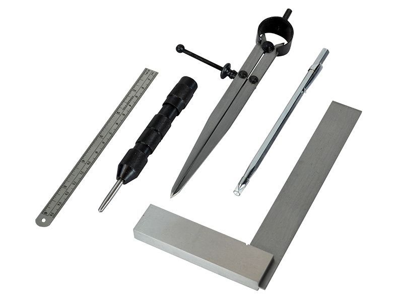 Contents: 1 x Divider 152mm (6in), 1 x Steel Rule 152mm (6in), 1 x Carbide Scribe 152mm (6in), 1 x Automatic Centre Punch and 1 x Square 127mm (5in)