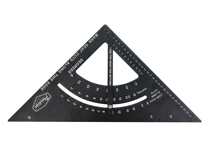 It combines the functions of a combination, try and framing square, and can be used to make basic measurements, as well as a saw guide for 45° and 90° cuts. It can also be used as a protractor, allowing the measurement of angles and pitches. This makes light and fast work of cutting wall shoulders (bird beaks) or rafter ends. The adjustable protractor arm can be locked in place with the brass screw, a useful feature when making repetitive cuts.