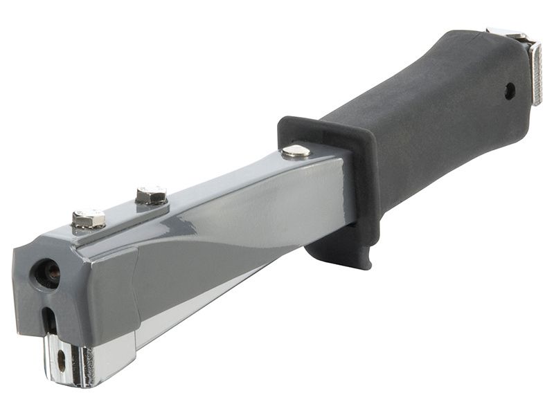 Professional hammer tacker with heavy-duty steel construction and anti-slip rubber grip handle. Removable handle pin releases magazine. Holds two full strips of Arrow T50® staples: 6, 8 and 10mm.