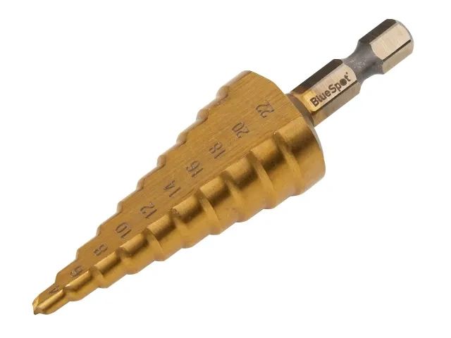 The BlueSpot Tools HSS 1/4in Hex Shank Step Drill is ideal for precision drilling in aluminium, brass, copper, plastic, steel and wood. Drills holes in 2mm increments from 4 - 22mm. Manufactured from high speed steel for increased durability and cutting power. Titanium coated to reduce friction and heat. 2mm step increments. The hex shank enables the step drill to be quickly fitted to any 1/4in power bit adaptor.