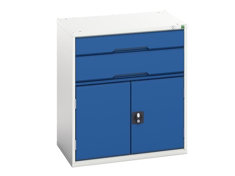 The Bott Verso Drawer-Door Cabinet has robust, fully welded steel housing and 100% extension drawers. The cupboard section has 1 galvanised steel shelf (75kg U.D.L.). It is fnished in durable powder coat paint in RAL 7035 light grey and RAL 5010 gentian blue.