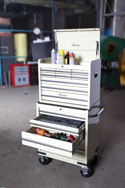 Classic 26" combination unit design to suit classic car owners and car enthusiasts with gas struts, lift latch, 5" locking castors and lockable ball bearing drawer slides for a smooth secure operation. Large design suitable for holding a large number of tools with 2mm drawer liners and 10mm top mat. Chrome plated side handles and full length aluminium drawer pulls with positive stop. Total storage solution for organizing and storing tools. 13 drawer combination made up of 9 drawer chest and 4 drawer trolley. Overall size: 676 x 461 x 1411mm.