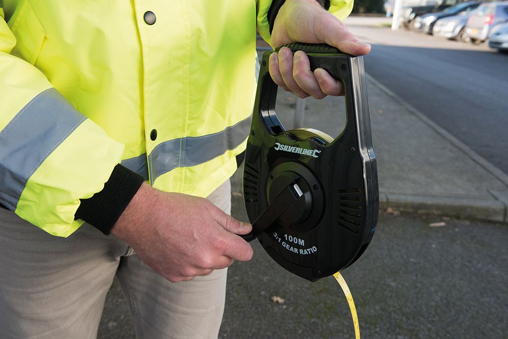 Tough ABS plastic casing. Stainless steel blade with corrosion-resistant magnetic hook clip. Manual 3:1 gear ratio gives a fast and fully controlled blade retraction. Comfortable, contoured grip and clear, easy-to-read graduations.