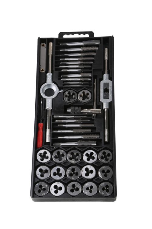 High quality alloy steel containing popular metric tap, dies and holders. Contains: 1 die handle, 1 tap wrench, 1 t-type tap wrench, 1 screw pitch gauge, and 17 tap and dies. Sizes: M3 x 0.5, M3 x 0.6, M4 x 0.7, M4 x 0.75, M5 x 0.8, M5 x 0.9, M6 x 1.0, M6 x 0.75, M7 x 1.0, M7 x 0.75, M8 x 1.25, M8 x 1.0, M10 x 1.5, M10 x 1.25, M12 x 1.75, M12 x 1.5, 1/8-27.