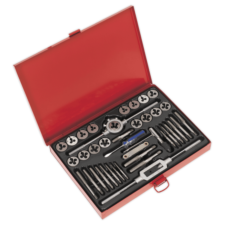| Contents | Taps & Dies; 3 x 0.5, 3 x 0.6, 4 x 0.7, 4 x 0.75, 5 x 0.8, 5 x 0.9, 6 x 0.75, 6 x 1, 7 x 0.75, 7 x 1, 8 x 1, 8 x 1.25, 10 x 1.25, 10 x 1.5, 12 x 1.5, 12 x 1.75mm, 1/8"NPT, Tap Wrench, T-Bar Tap Wrench, Die Holder, Screwdriver, Thread Gauge |