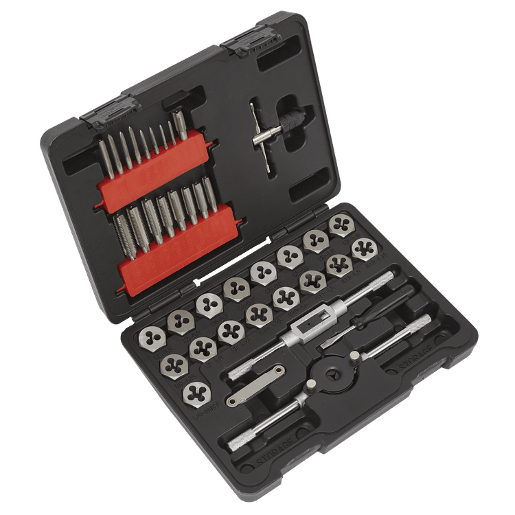 | Contents | Taps & Dies; M3 x 0.5, M3 x 0.6, M4 x 0.7, M4 x 0.75, M5 x 0.8, M5 x 0.9, M6 x 1, 7 x 1, M8 x 1.25, M9 x 1, M9 x 1.25, M10 x 1.25, M10 x 1.5, M11 x 1.5, M12 x 1.5, M12 x 1.75, 1/8”-28BSP, Tap Wrench, T-Handle Tap Wrench, Die Holder, Metric Thread Gauge, Screwdriver. |
