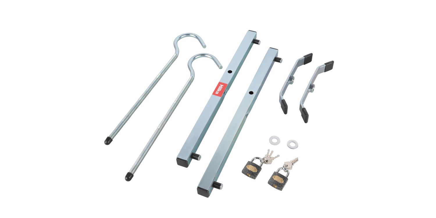 A quick, easy and safe way to secure a ladder to roof racks. Protects against crosswinds, accidents and theft. Simply place the ladder on the racks, the bar on the ladder with the hook around the rack and tighten with the wing-nut bar and lock.