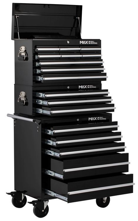 Heavy duty all steel construction with ball bearing slides with positive stop. 5" casters with reinforced cabinet base comes with protective top mat and drawer liners. Keyed locking mechanism full length aluminium drawer pulls, chrome side handles and lockable casters. Consists of: 9 drawer tool chest with 5 drawer rollaway cabinet and 3 drawer add on chest. Overall dimensions including castors: width 685 x depth 465 x height 1464mm.
