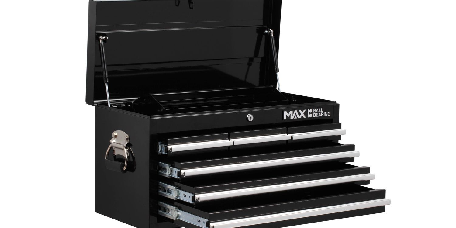 Heavy duty all steel construction with ball bearing slides with positive stop. Comes with drawer liners keyed locking mechanism full length aluminium drawer pulls and chrome side handles. Overall dimensions: width 660 x depth 305 x height 365mm. Top compartment: 654 x 299 x 40mm. Large drawer: 575 x 265 x 66mm, 2 medium drawers: 575 x 265 x 51mm, 3 small drawers: 170 x 265 x 51mm. Tote tray in top compartment.