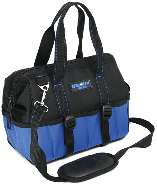 Hard bottomed tool bag with heavy duty shoulder straps, handles and zips. Supplied Empty. Dimensions: H: 10.5" x W: 12.5" x D: 7.5".