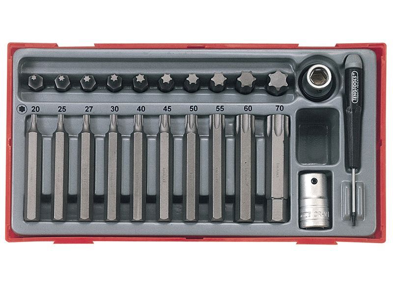 This TTX23 socket set consisting of 20 regular and long bits for internal TX heads. It also includes 2 adaptors and a 2mm Hex mini screwdriver.