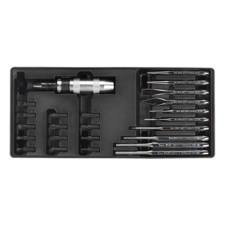 | Contents | 1/2"Sq Drive Impact Driver, Slotted Bits; 5, 6, 8, 10, 12mm, Phillips Bits; #1, #2, #3, #4mm, Hex Bits; 4, 5, 6, 8mm, Adaptor; 1/2"Sq Drive x 8mm Hex Adaptor, #2 x 9.5 x 120mm Centre Punch, Ø3 x 9.5 x 120mm Taper Pin Punch, 12 x 9.5 x 130mm Cold Chisel, 5 x 9.5 x 130mm Utility Chisel, Parallel Pin Punches; Ø2 x 8 x 115, Ø3 x 8 x 125, Ø4 x 9.5 x 150, Ø5 x 9.5 x 165, Ø6 x 12.7 x 180, Ø8 x 12.7 x 180mm |