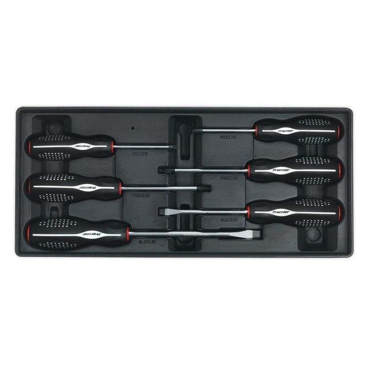 Upgrade your toolbox with this handy 6-piece Sealey TBT14 Tool Tray and Screwdriver Set. This set is perfect for professionals or beginner mechanics and is ideal for easy storage in garages, workshops and toolsheds. This tray features six carefully selected tools from our Premier Line range, and are backed with our no-quibble lifetime warranty.